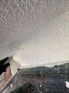 高圧洗浄機でしっかりと旧塗膜を洗い流し、「ニューマイルド優雅」を吹き付け塗装にて散布していきます。