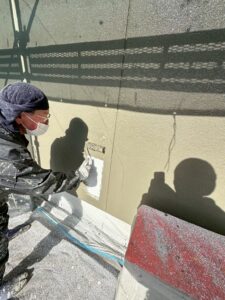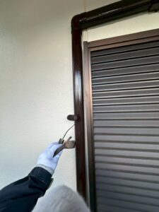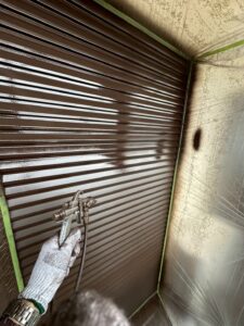 雨戸は凹凸が激しく、ローラーやハケでは均等に塗り広げることが難しいため、吹き付けで行います。