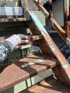 現地を確認すると、階段全体に錆が進行しており、放置すると腐食や安全性の低下につながる状態でした。